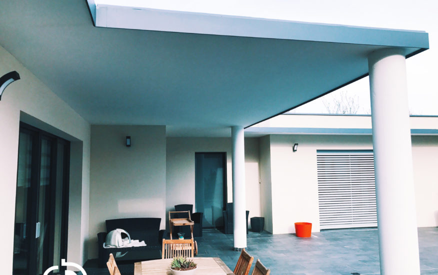 Maison contemporaine de plain-pied dans un parc arboré avec piscine, casquette béton, toiture plate.